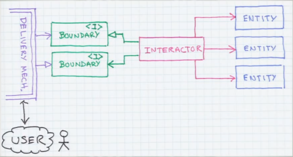 그리고, Use case와 툴을 포함한 그 외 외부를 나누기 위한 방법으로, 그림에서 표현한 것과 같이 Boundary라는 인터페이스를 둔다. 해당 인터페이스를 통해 Use case로 들어오는 요청을 모두 같은 형태로 들어오도록 만들고, Use case로 부터 응답이 나갈때도 항상 정해진 형태로 나갈 수 있도록 한다. 때문에 Delivery mech. 의 위치에 어떤 종류의 프레임워크가 붙어도 관계가 없어지는 것이다.