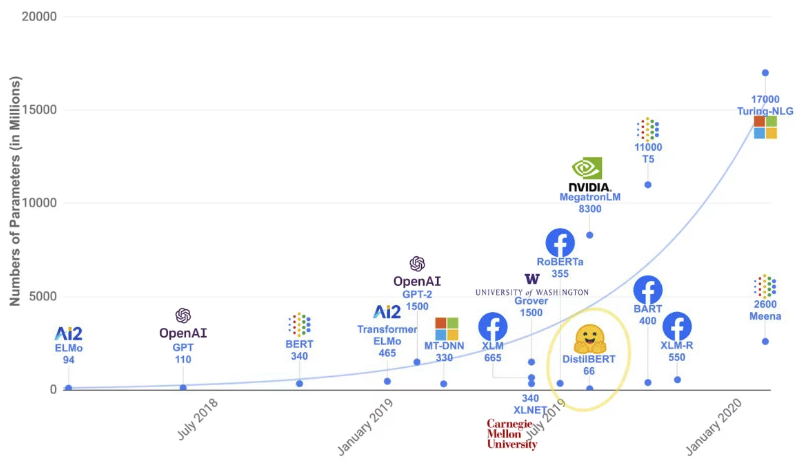 아래 이미지는 GPT-3가 탄생하기 이전에 빅테크 기업들이 만들어 낸 모델의 파라미터 수를 나타낸 것이다.