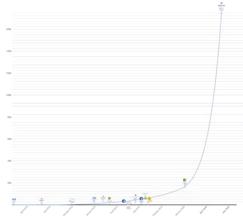 가장 오른쪽 위에 표시된 것이 GPT-3이다. GPT-3가 나타나기 이전의 모델들과는 비교도 안되는 파라미터 수를 가지고 있음을 한 눈에 알 수 있다.