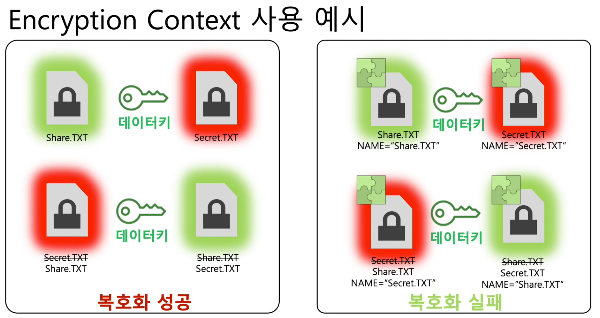 그런데 오른쪽 이미지처럼, Encryption Context로 파일명을 설정해놓는다면, 이름이 변경된 파일을 복호화 할 때 Encryption Context 설정에 위반되기 때문에 복호화가 되지 않는다.