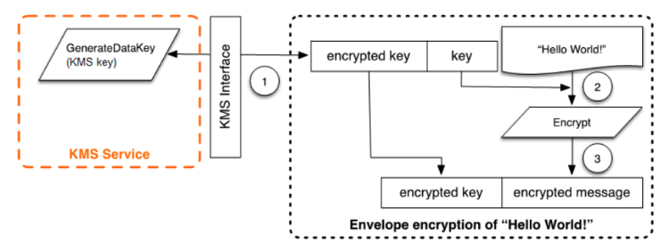 KMS에서 제공하는 GenerateDataKey 라는 인터페이스를 통해 평문을 봉투 암호화 할 수 있다.