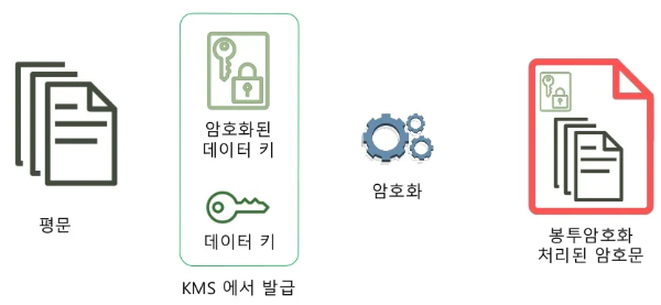 봉투암호화는 데이터를 암호화하는데 사용하는 Key(Data Key)를 암호화된 데이터와 함께 보관하는 방식을 말한다. 이 때 Key는 Master Key로 암호화 된다.