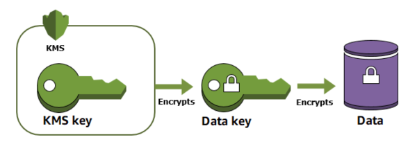 Master Key를 이용해서 Data Key를 암/복호화하고, Data Key를 이용하여 데이터를 암/복호화하는 계층형 구조로 되어 있다. 데이터를 암호화 하기 위해 KMS에 Data Key를 요청하면, KMS는 평문 Data Key와 암호화된 Data Key를 준다.