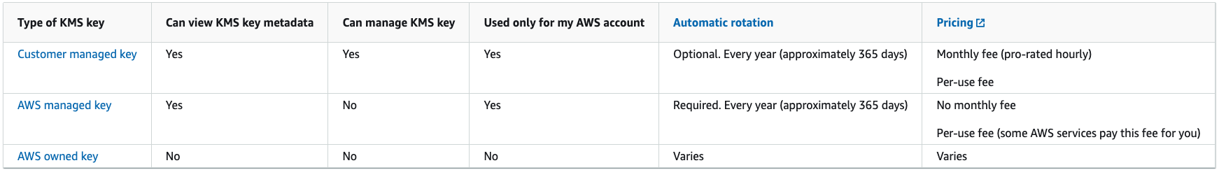 KMS Key는 다음과 같이 크게 세가지로 나눌 수 있다: CMK(Customer Managed Key), AWS Managed Key, AWS Owned Key.