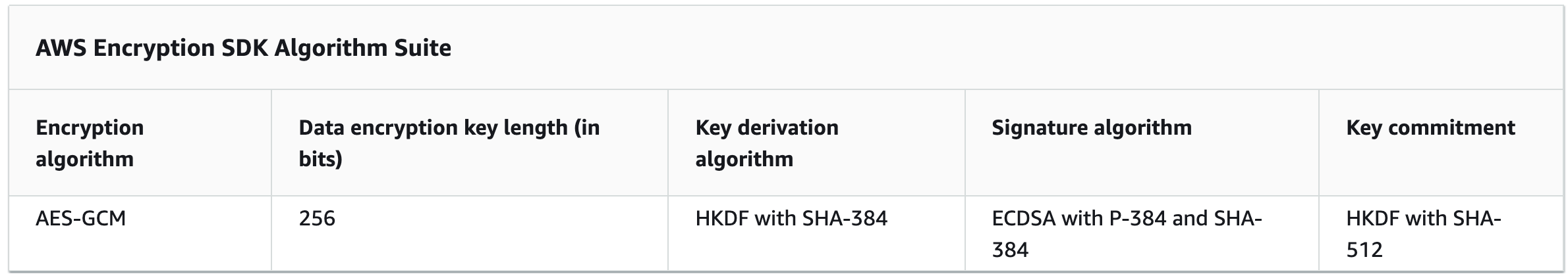 - https://docs.aws.amazon.com/encryption-sdk/latest/developer-guide/supported-algorithms.html