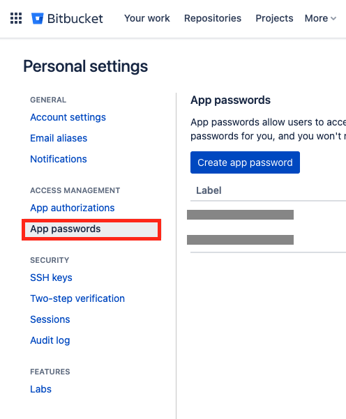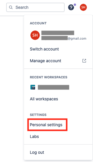 우선 Bitbucket에 접속해서 로그인을 하면, 우측 상단에 아래와 같이 자신의 프로파일에 대한 메뉴를 확인할 수 있다. 거기서 "Personal settings"를 클릭한다.