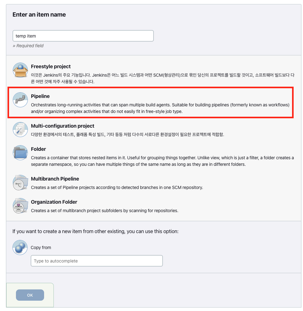 그리고, 해당 item에 대한 이름을 입력하고, "Pipeline"을 클릭한다.