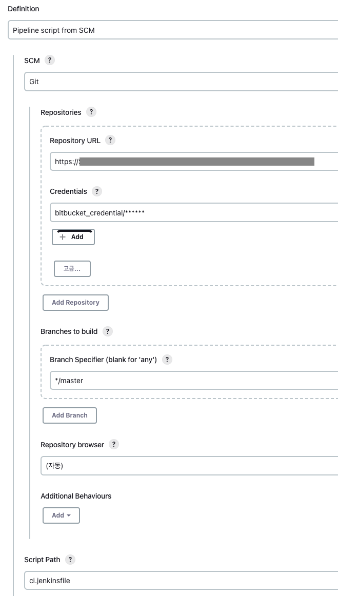 Repository URL은 파이프라인 스크립트가 저장되어 있는 저장소 주소를 입력하고, Credential에서는 아까 생성한 Bitbucket Credential을 선택하면 된다. 그 외에 해당 git의 어떤 Branch에서 내용을 가져올 것인지 입력하고, 파이프라인에 적용하고자하는 jenkinsfile의 이름 및 경로(나는 ci.jenkinsfile이라는 이름의 파일을 이용했다)를 입력하고 저장한다.