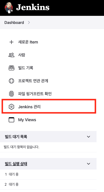 먼저 Jenkins 좌측 메뉴 중 "Jenkins 관리"로 들어간다.