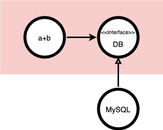 위 그림에서 비즈니스 로직의 영역을 BusinessLogic 클래스 뿐만 아니라 인터페이스 영역까지(분홍색 영역)로 확대하고, 그 중 외부 요소와의 인터페이스의 역할을 하는 DB 인터페이스를 통해, 외부요소인 MySQL이 상속할 수 있도록 하면, 외부 요소가 비즈니스 로직 방향으로 의존하게 만들 수 있다.