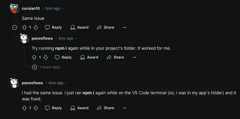 패키지들을 삭제하고 재설치하고, 컴퓨터를 껐다가 켜도 안되서, 더 찾아보니 작업하고 있는 프로젝트 디렉토리에서 npm install을 해보라는 얘기가 있어서 해봤더니 해결됨.